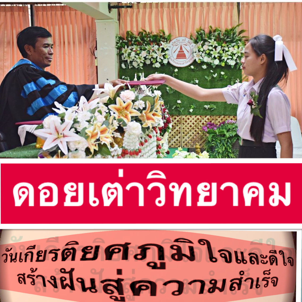 เช้าวันที่ 26 กุมภาพันธ์ 2563 ดร.วิทยา พัฒนเมธาดา ผู้อำนวยการโรงเรียนดอยเต่าวิทยาคม พร้อมด้วยคณะครูและบุคลากรทางการศึกษา ร่วมแสดงความยินดีกับนักเรียนที่ได้โควต้าเรียนต่อในมหาวิทยาลัย และมอบเกียรติบัตร ให้กับ นักเรียนดีเด่นด้านต่าง ๆ และให้โอวาท เกี่ยวกับการดำเนินชีวิตโดยยึดหลักความพอเพียง พอประมาณ การมีเหตุมีผล ความไม่ประมาท และการเป็นพลเมืองดีมีจิตอาสา และจัดกิจกรรมปัจฉิมนิเทศ ให้กับนักเรียนชั้นมัธยมศึกษาปีที่ 3 และ 6 รุ่นที่ 43 ” ธ คือปราชญ์แห่งแผ่นดิน” ณ ห้องประชุมสะเลียมหวานโรงเรียนดอยเต่าวิทยาคม ผอ.ร.ร.ดอยเต่าวิทยาคม กล่าวว่า ที่เรียกชื่อรุ่นว่า “ ธ คือปราชญ์แห่งแผ่นดิน” เพราะรุ่นนี้โรงเรียนได้จัดสร้างศาลา ธ คือปราชญ์แห่งแผ่นดินสำเร็จ เพื่อเป็นสถานที่อันศักดิ์สิทธิ์น้อมรำลึกถึงพระบาทสมเด็จพระปรมินทรมหาภูมิพลอดุลยเดช และจัดกิจกรรมเกี่ยวกับพระบรมวงศานุวงศ์ นิทรรศการ หลักการทรงงาน ของพระบาทสมเด็จพระบรมชนกาธิเบศร มหาภูมิพลอดุลยเดชมหาราช บรมนาถบพิตร ในหลวงรัชการที่ 9