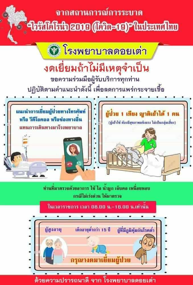 นอกจากนี้ ทางโรงพยาบาลดอยเต่ายังได้แจ้งประกาศ ของโรงพยาบาลดอยเต่า ให้ญาติผู้ป่วย ปฏิบัติตาม แนวปฏิบัติ ป้องกันโรค อย่างเคร่งครัดและห้ามเยี่ยมคนไข้ โดยไม่จำเป็น