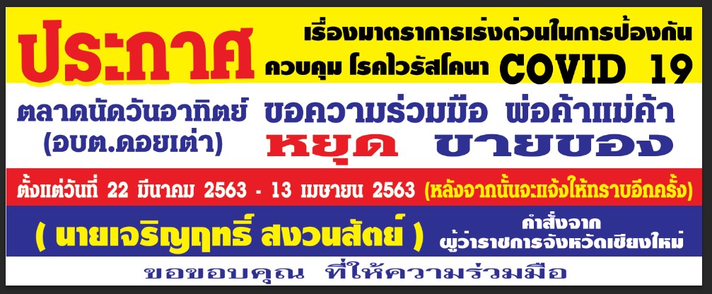 เช้าวันที่ 23 มี.ค.63 นายอนุรักษ์ ก๋องโน นายกองค์การบริหารส่วนตำบลดอยเต่า เชียงใหม่ แจ้งว่า อบต.ดอยเต่า ได้แจ้งประกาศในส่วนที่รับผิดชอบ ในตำบลดอยเต่า อย่างเคร่งครัด ขอความร่วมมือให้ร่วมกันปฏิบัติ ตามมาตรการที่แจ้ง เราต้องร่วมมือกันฝ่าวิกฤตนี้ไปด้วยกัน