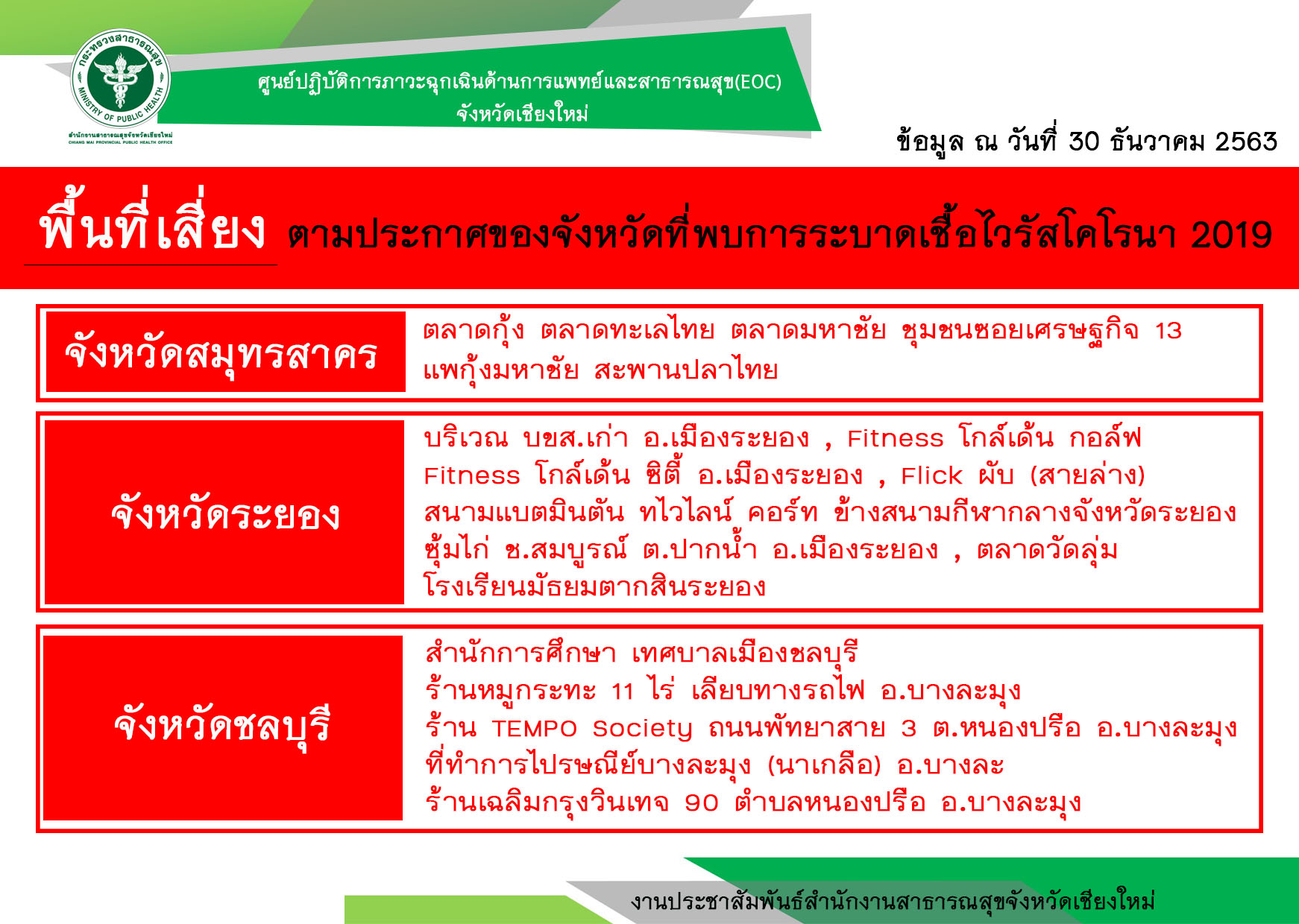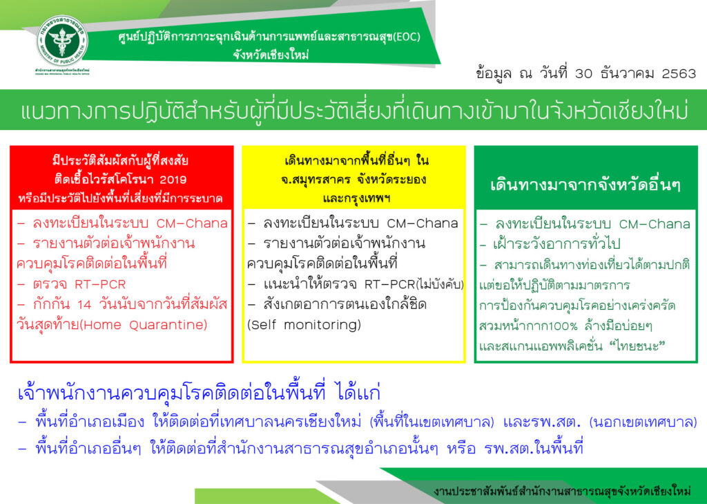 สาธารณสุข จ.เชียงใหม่ ออกประกาศใครที่เดินทางมาจาก 3 จังหวัด คือ สมุทรสาคร ระยอง และชลบุรีเข้ามาในพื้นที่จังหวัดเชียงใหม่ต้องถูกกักตัว 14 วันพร้อมตรวจโรค