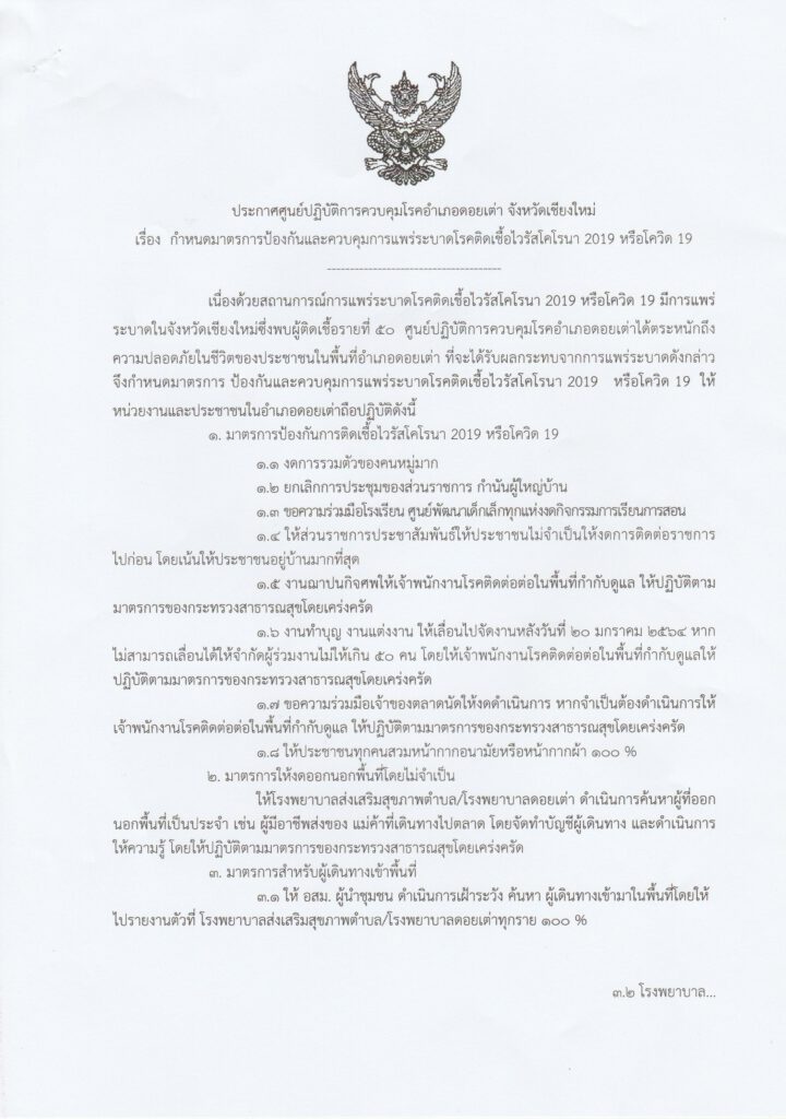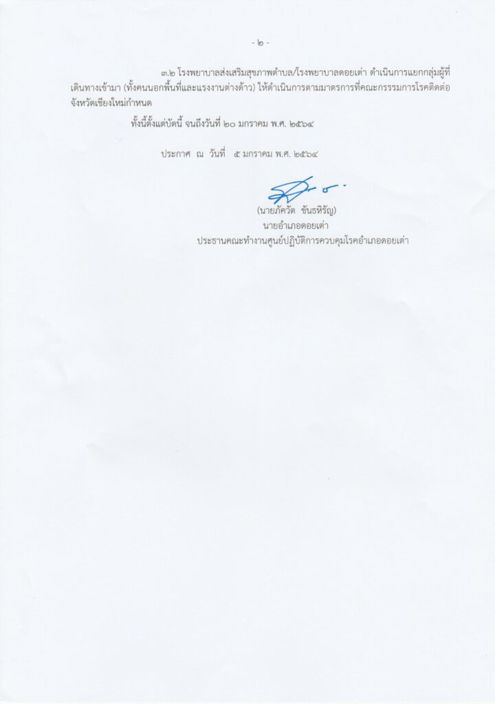 – ให้รพ.สต. ,รพ.ดอยเต่าดำเนินการแยกกลุ่มผู้ที่เดินทางเข้ามา(ทั้งคนนอกพื้นที่และแรงงานต่างด้าว) ให้ดำเนินการตามมาตรการที่คณะกรรรมการโรคติดต่อจังหวัดเชียงใหม่กำหนด