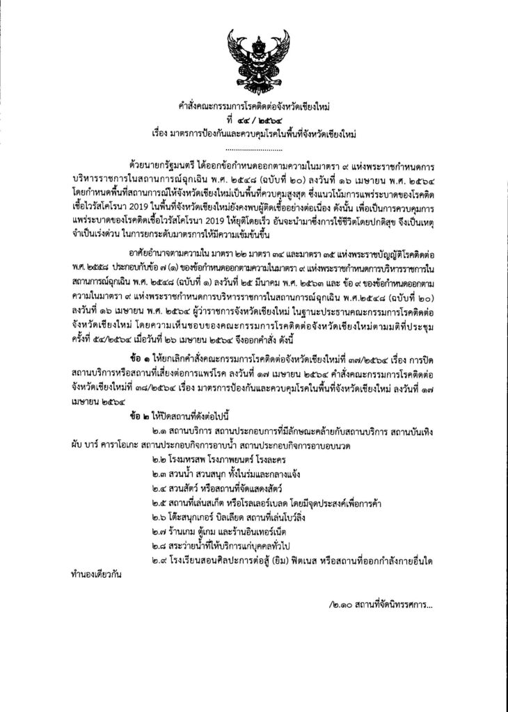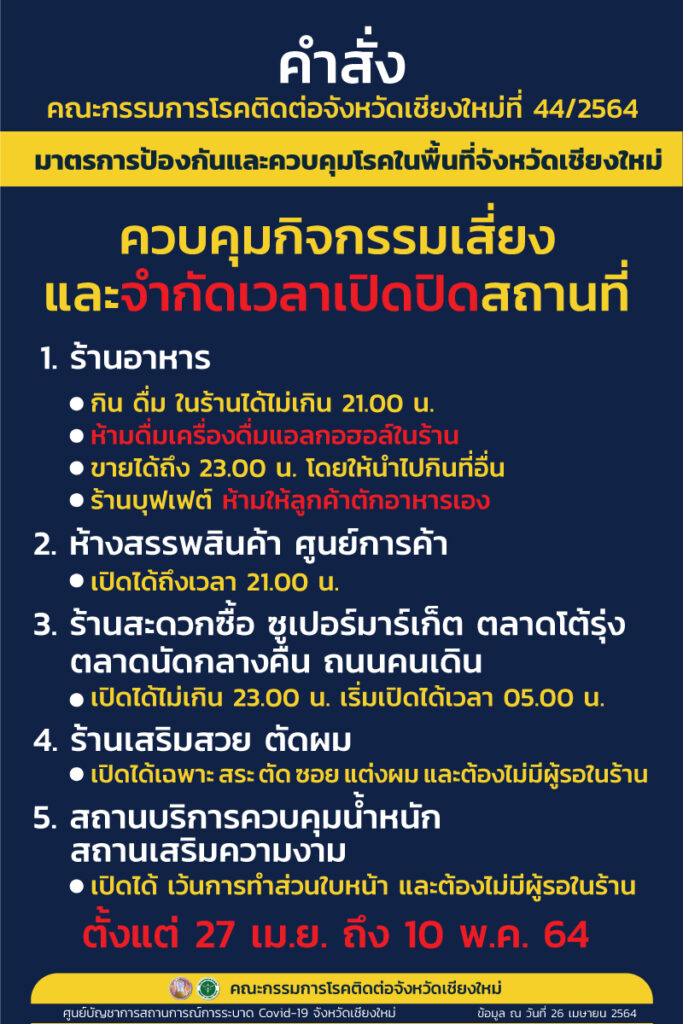 วันที่ 26 เม.ย. 64 คำสั่งคณะกรรมการโรคติดต่อจังหวัดเชียงใหม่มีมติออกคำสั่งฯ ที่ 44/2564 เรื่อง มาตรการป้องกันและควบคุมโรคในพื้นที่จังหวัดเชียงใหม่ โดยมีสาระสำคัญคือ ให้ปิดสถานที่ รวมทั้งสิ้น 19 ประเภท ประกอบด้วย 1 สถานบริการ สถานประกอบการฯ สถานบันเทิง ผับ บาร์ คาราโอเกะ สถานประกอบกิจการ อาบน้ำ/อาบอบนวด 2 โรงมหรสพ โรงภาพยนตร์ โรงละคร 3 สวนน้ำ สวนสนุก 4 สวนสัตว์ 5 ลานสเก็ต โรลเลอร์เบลด 6 โต๊ะสนุกเกอร์ บิลเลียด โบว์ลิ่ง 7 ร้านเกม ตู้เกม ร้านอินเทอร์เน็ต 8 สระว่ายน้ำ 9 โรงเรียนสอนศิลปะการต่อสู้ (ยิม) ฟิตเนส 10 ที่จัดนิทรรศการ ศูนย์แสดงสินค้า และศูนย์ประชุม 11 พิพิธภัณฑ์ 12 ห้องสมุดสาธารณะ/ชุมชน/เอกชน 13 สถานรับเลี้ยงเด็ก ศูนย์พัฒนาเด็กเล็ก 14 สถานดูแลผู้สูงอายุ 15 สถานที่สัก-เจาะผิวหนัง/ร่างกาย 16 โรงเรียนสอนลีลาศ/เต้นรำ 17 ศูนย์พระเครื่อง สนามพระ ซุ้มพระเครื่อง 18 สนามแข่งขันทุกประเภท 19 ห้องประชุม ห้องจัดเลี้ยง โดยให้มีผลตั้งแต่วันที่ 27 เม.ย. ถึงวันที่ 10 พ.ค. 2564