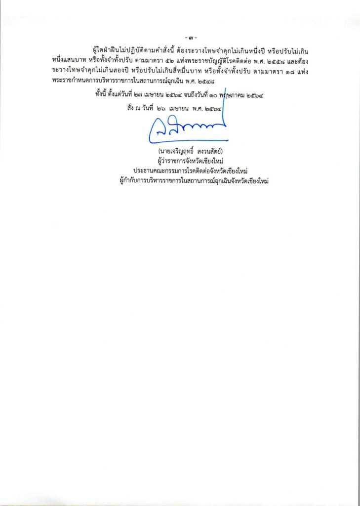 ทั้งนี้ คำสั่งฯ ฉบับที่ 44/2564 ยังให้ยกเลิกคำสั่งคณะกรรมการโรคติดต่อจังหวัดเชียงใหม่ที่ 37/2564 เรื่อง การปิดสถานบริการหรือสถานที่เสี่ยงต่อการแพร่โรค ลงวันที่ 17 เมษายน 2564 คำสั่งคณะกรรมการโรคติดต่อจังหวัดเชียงใหม่ที่ 38/2564 เรื่อง มาตรการป้องกันและควบคุมโรคในพื้นที่จังหวัดเชียงใหม่ ลงวันที่ 17 เมษายน 2564 โดยมีบทกำหนดโทษคือ ผู้ใดฝ่าฝืนไม่ปฏิบัติตามคำสั่งนี้ ต้องระวางโทษจำคุกไม่เกิน 1 ปี หรือปรับไม่เกิน 100,000 บาท หรือทั้งจำทั้งปรับ