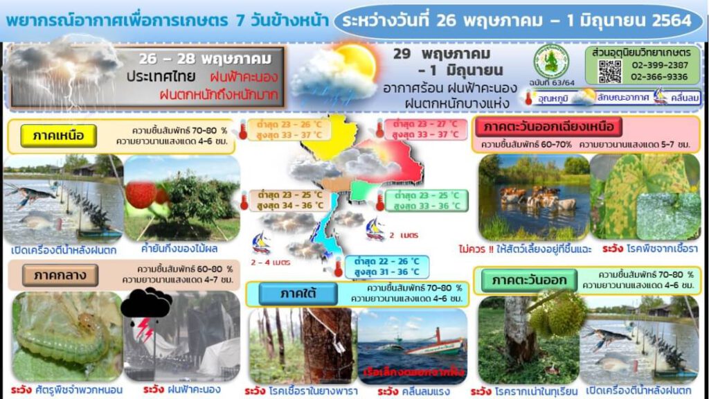 ลักษณะอากาศทั่วไป พยากรณ์อากาศ 24 ชั่วโมงข้างหน้า ร่องมรสุมพาดผ่านภาคเหนือตอนล่าง ภาคกลาง และภาคตะวันออกเฉียงเหนือ ประกอบกับมรสุมตะวันตกเฉียงใต้กำลังแรงพัดปกคลุมทะเลอันดามัน ภาคใต้ และอ่าวไทย ลักษณะเช่นนี้ทำให้ภาคเหนือ ภาคตะวันออกเฉียงเหนือ ภาคตะวันออก และภาคใต้ มีฝนตกหนักบางแห่ง ขอให้ประชาชนบริเวณดังกล่าวระวังอันตรายจากฝนตกหนักที่เกิดขึ้นในระยะนี้