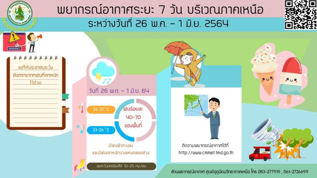 ภาคเหนือ เมฆเป็นส่วนมาก กับมีฝนฟ้าคะนองร้อยละ 60 ของพื้นที่ และฝนตกหนักบางแห่ง บริเวณจังหวัดตาก กำแพงเพชร พิจิตร พิษณุโลก และเพชรบูรณ์