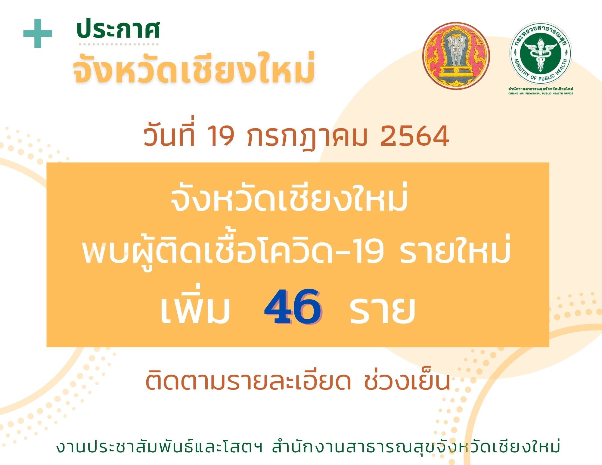 วันนี้ 19 ก.ค. 64 ที่ศูนย์บัญชาการสถานการณ์การระบาดโรค Covid-19 จังหวัดเชียงใหม่ ดร.ทรงยศ คำชัย หัวหน้ากลุ่มงานควบคุมโรคติดต่อ สำนักงานสาธารณสุขจังหวัดเชียงใหม่ แถลง ว่าวันนี้จังหวัดเชียงใหม่พบผู้ติดเชื้อรายใหม่เพิ่มขึ้น 46 ราย ไม่มีผู้เสียชีวิตเพิ่ม ทำให้ยอดผู้เสียชีวิตสะสมของจังหวัดเชียงใหม่ยังอยู่ที่ 27 ราย